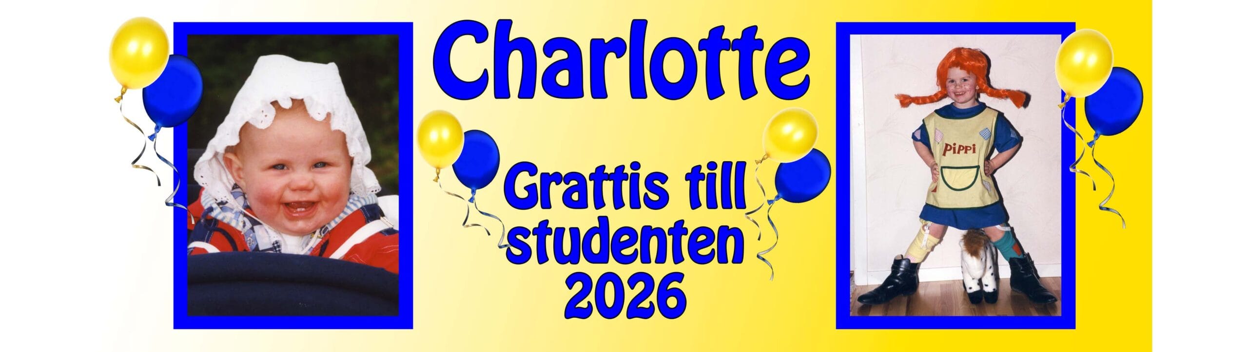 Hos oss kan du skapa en banderoll som är helt unik för din student. Välj mellan flera storlekar – från 150×50 cm till 225×75 cm – och anpassa designen med valfri text och bild. Extra populärt är att använda ett charmigt foto från barndomen, kanske från en rolig eller nostalgisk stund som får gästerna att le och minnas tillbaka.