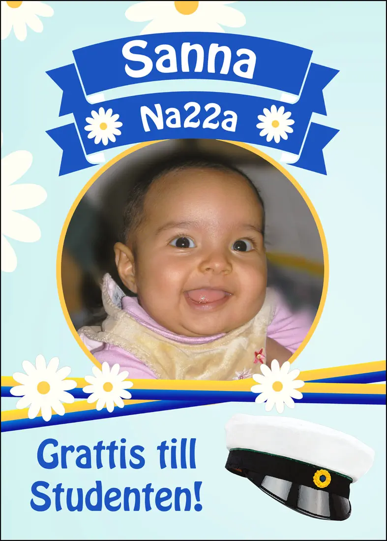 Gör studentfirandet ännu mer personligt med en studentskylt som har ett runt hål för bilden. Dessutom erbjuder vi flera produkter som kompletterar ditt firande, som studentbanderoller, inbjudningar och tackkort – allt enkelt beställt direkt via vår hemsida. Så här gör du: skapa din design online och se omedelbart hur din studentskylt kommer att se ut.